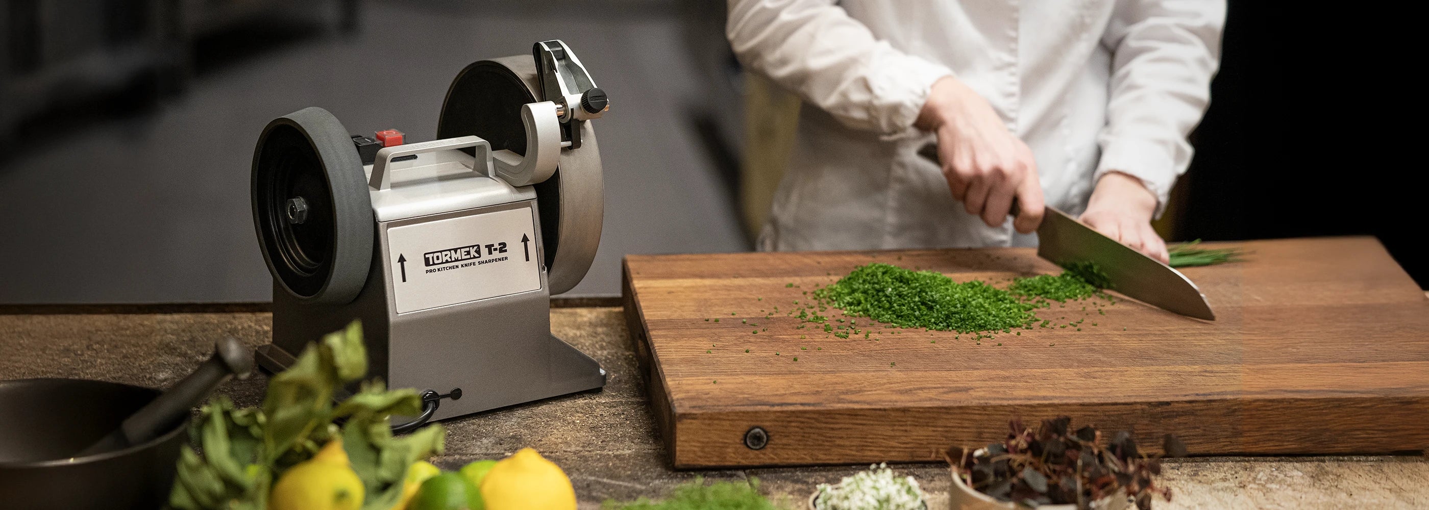 The Tormek T-1 Kitchen Knife Sharpener allows home chefs to sharpen their knives to professional results. At home, in their own kitchen. It is certified for home use only.