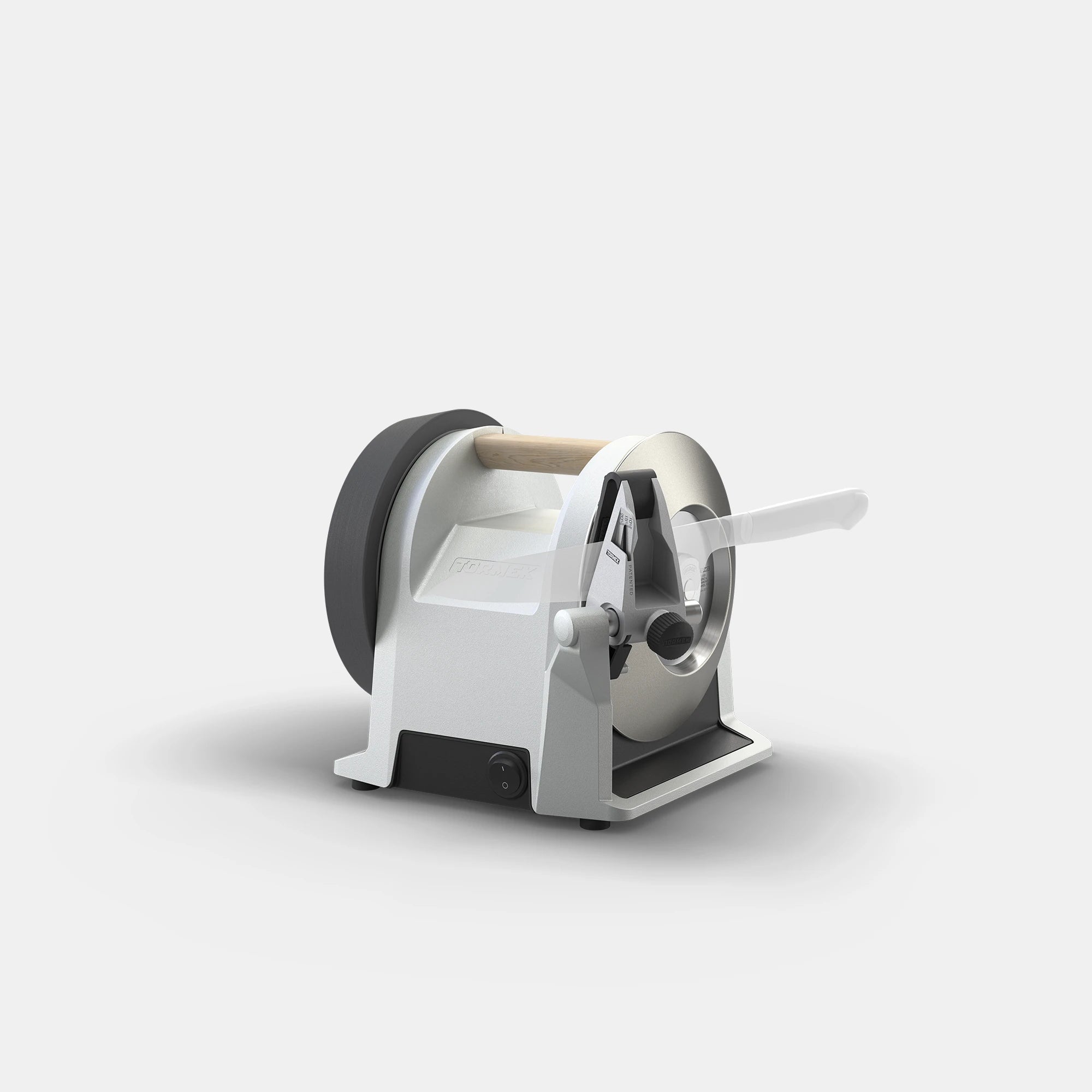 With the Tormek T-1 Kitchen Knife Sharpener you sharpen the entire bevel of your knife creating a new apex. The low RPM and precise angle setting ensures minimal steel removal and eliminates risk of overheating your edge. Professional sharpness at home!